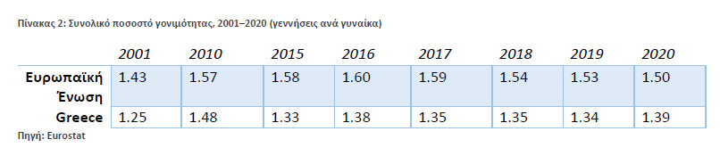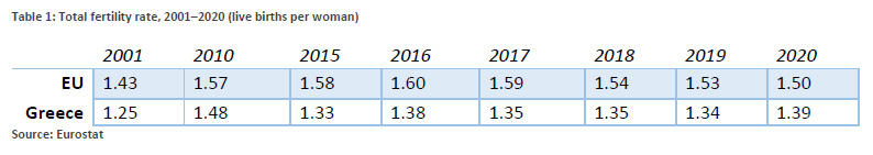 Αυτή η κατάσταση είναι ιδιαίτερα εμφανής στην Ελλάδα. Το 2020 η μέση ηλικία των Ελληνίδων που απέκτησαν μωρό ήταν 30,7, σε σύγκριση με τη μέση ηλικία των γυναικών της Ευρωπαϊκής Ένωσης που ήταν 29,5. Επίσης, το 2020, το συνολικό ποσοστό γονιμότητας στην Ελλάδα ήταν 1,39 ζωντανές γεννήσεις ανά γυναίκα σε σύγκριση με τον μέσο όρο της Ευρωπαϊκής Ένωσης που ήταν 1,50 (πηγή: Eurostat – Πίνακας 1).